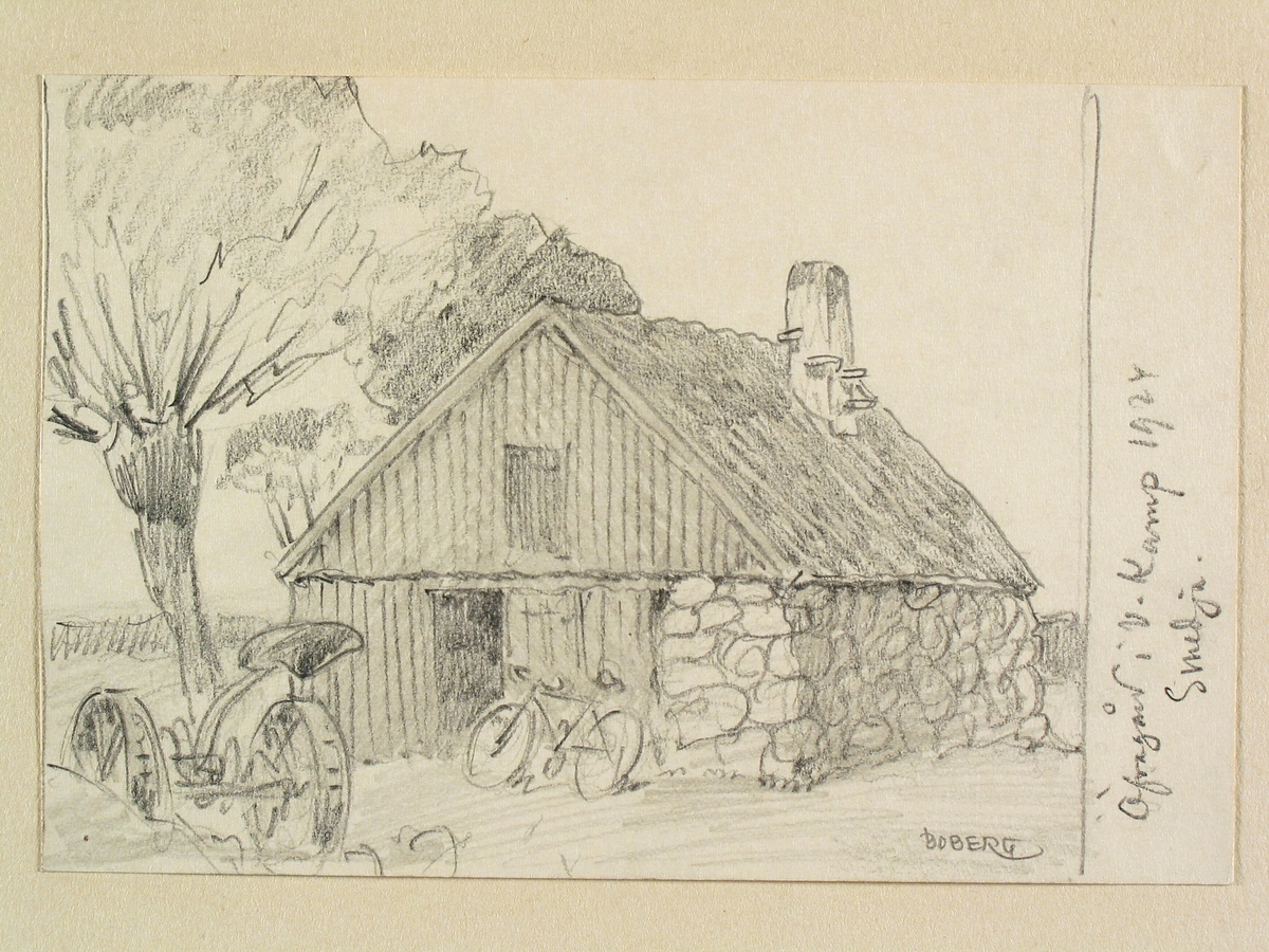 Skåne, Bjäre hd., Västra Karups sn., Övragård. Smedja. Teckning av Ferdinand Boberg.