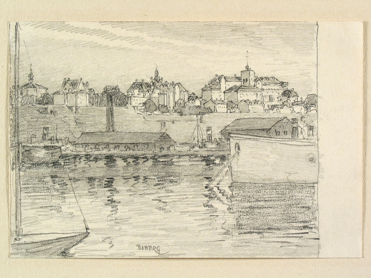 Teckning av Ferdinand Boberg. Stockholm, Söder, Utsikt av Söder, trakten av Ersta.