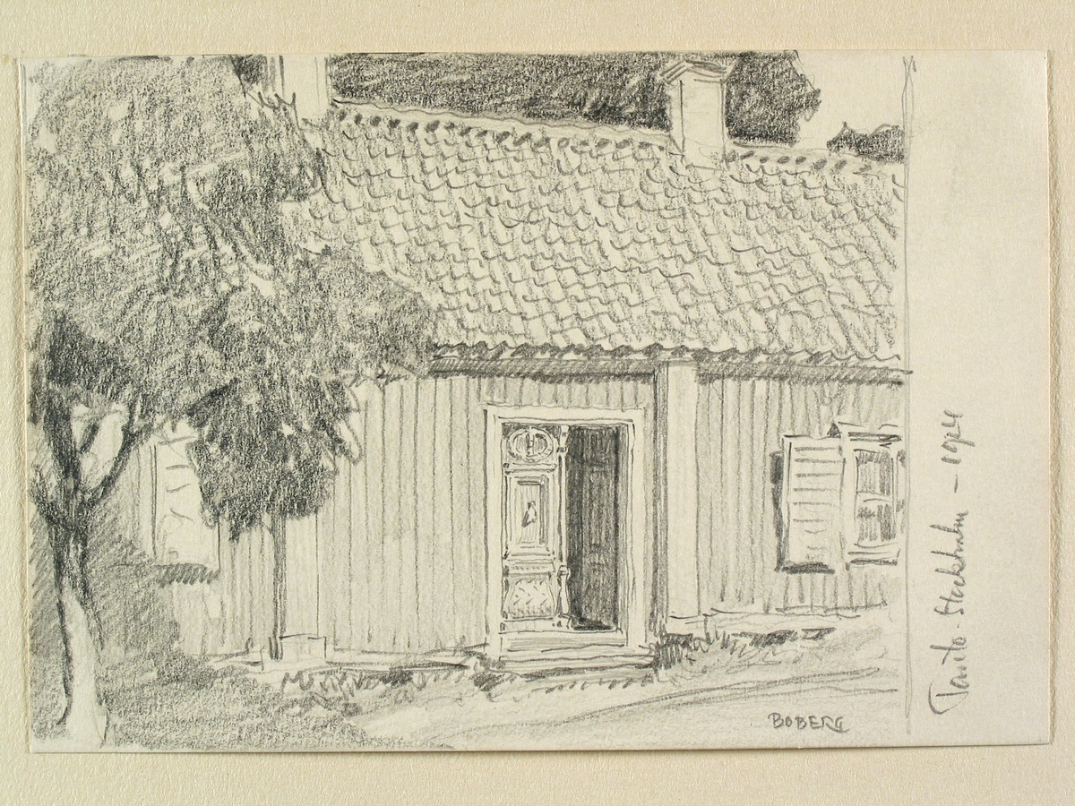 "Tanto Stockholm, 1924" Södermalm,bostadshus medfönsterluckor och öppen ytterdörr. Teckning av Ferdinand Boberg.