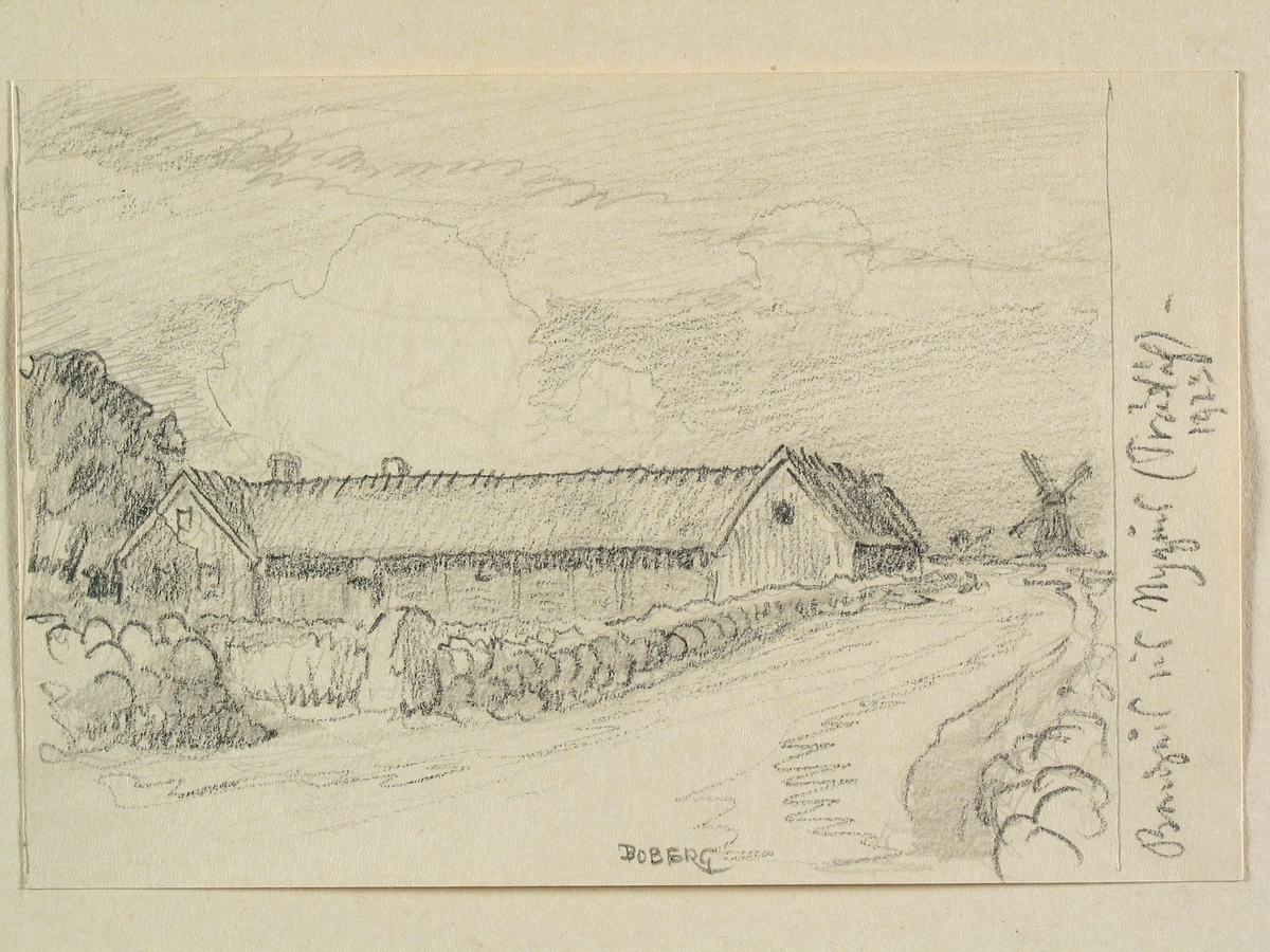 Halland, Himle hd., Träslövs sn. "Bondgård vid Nygård". Teckning av Ferdinand Boberg