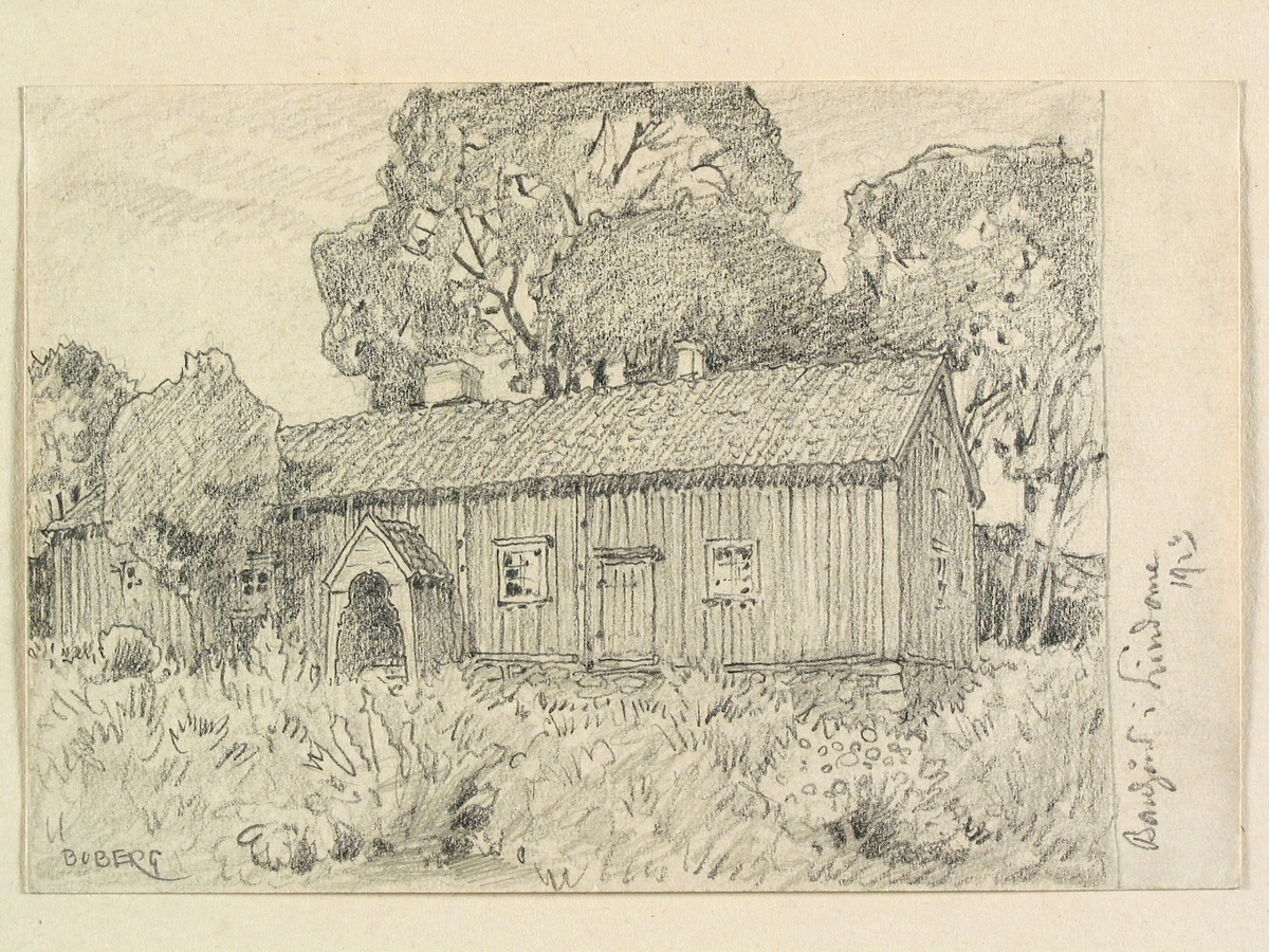 Halland, Fjäre hd., Lindome sn. "Bondgård i Lindome". Teckning av Ferdinand Boberg