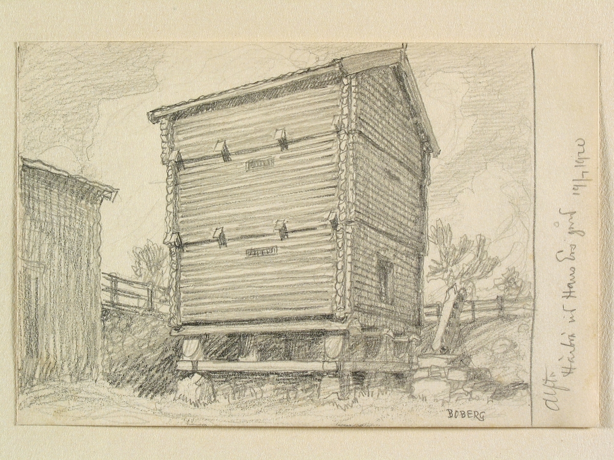 Hälsingland, Alfta. Härbre vid Hans Ers gård. Teckning av Ferdinand Boberg