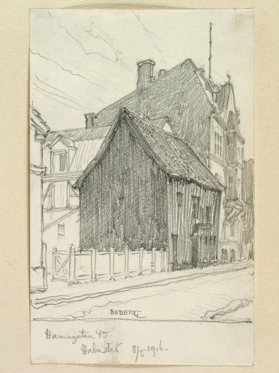 Teckning av Ferdinand Boberg. Halmstad, Hamngatan 45