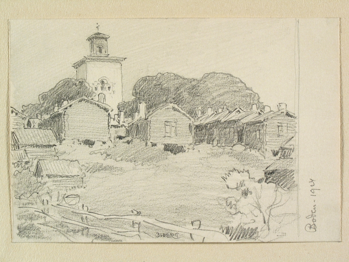 Teckning av Ferdinand Boberg. Norrbotten, Över-Luleå sn, Boden, Kyrkstaden