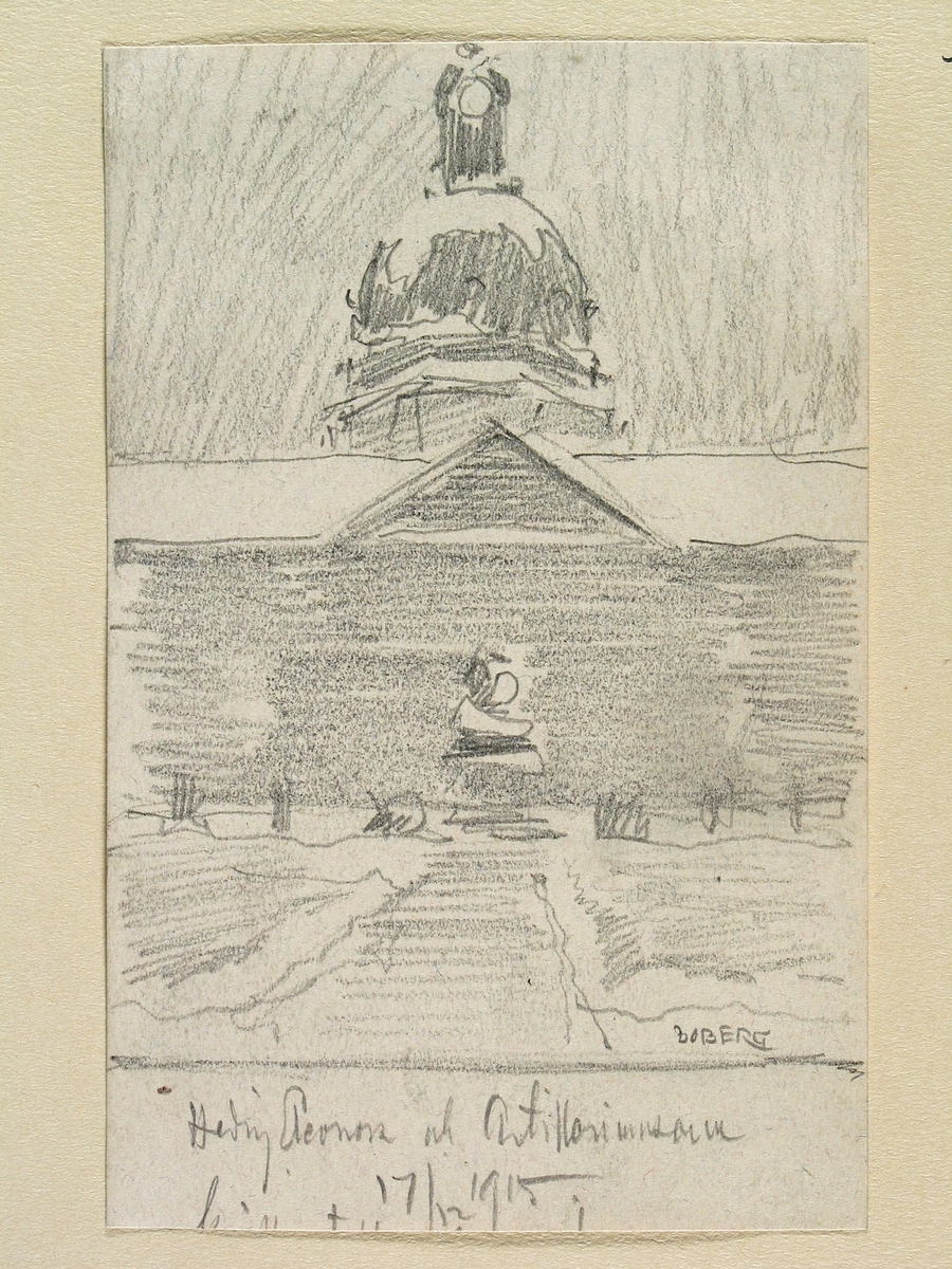 Teckning av Ferdinand Boberg. Stockholm, Östermalm, Kv. Läderkanonen, Hedvig Eleonoras kyrka, Artillerimuseum