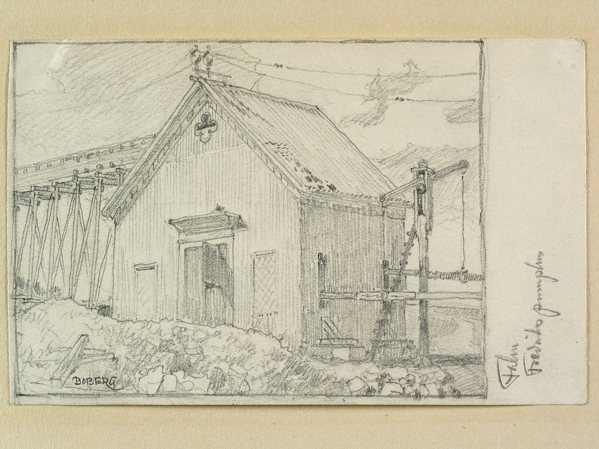 Teckning av Ferdinand Boberg. Falun, Falu gruva, Fredriks pumphus