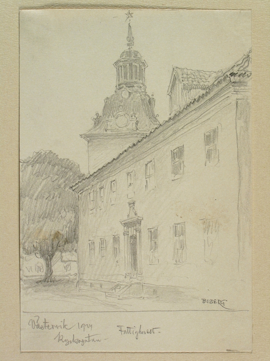 Teckning av Ferdinand Boberg. Västervik, Kyrkogatan, Fattighuset
