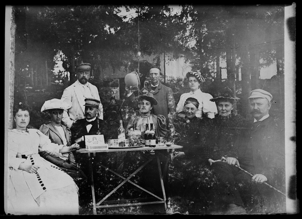 Ett sällskap sittande utomhus vid ett bord med punch- och ölflaskor.