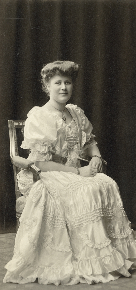 Atejéporträtt av Annie Schumburg f. Göransson iförd ljus sidenklänning.