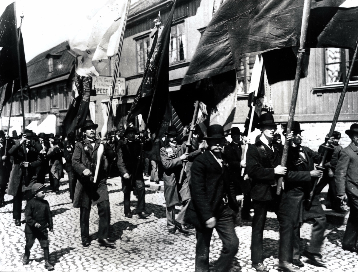 Demonstration. Stockholm, 1:a maj 1902. Män i demonstrationståg med fanor.