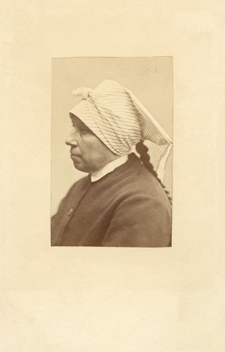 Porträtt på en kvinna från Södermanland i en trekantig huvudbonad, knuten fram och med snibb bak.