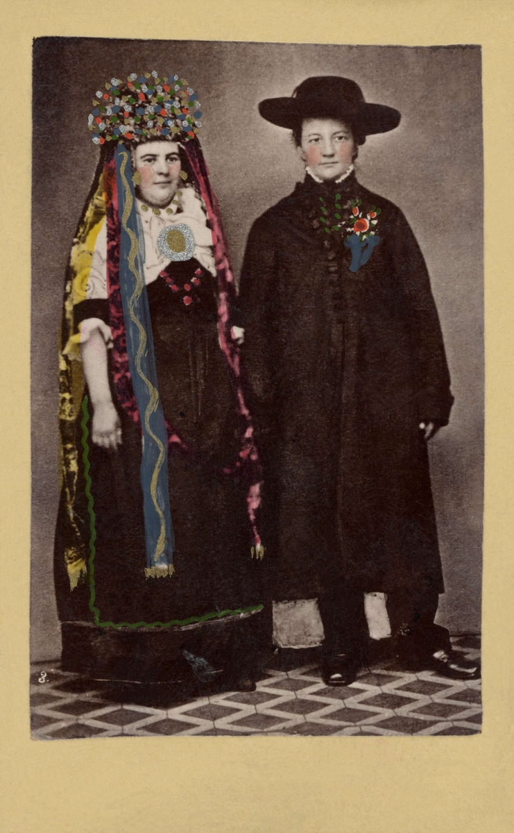 Ett brudpar i folkdräkt. Kolorerat fotografi.