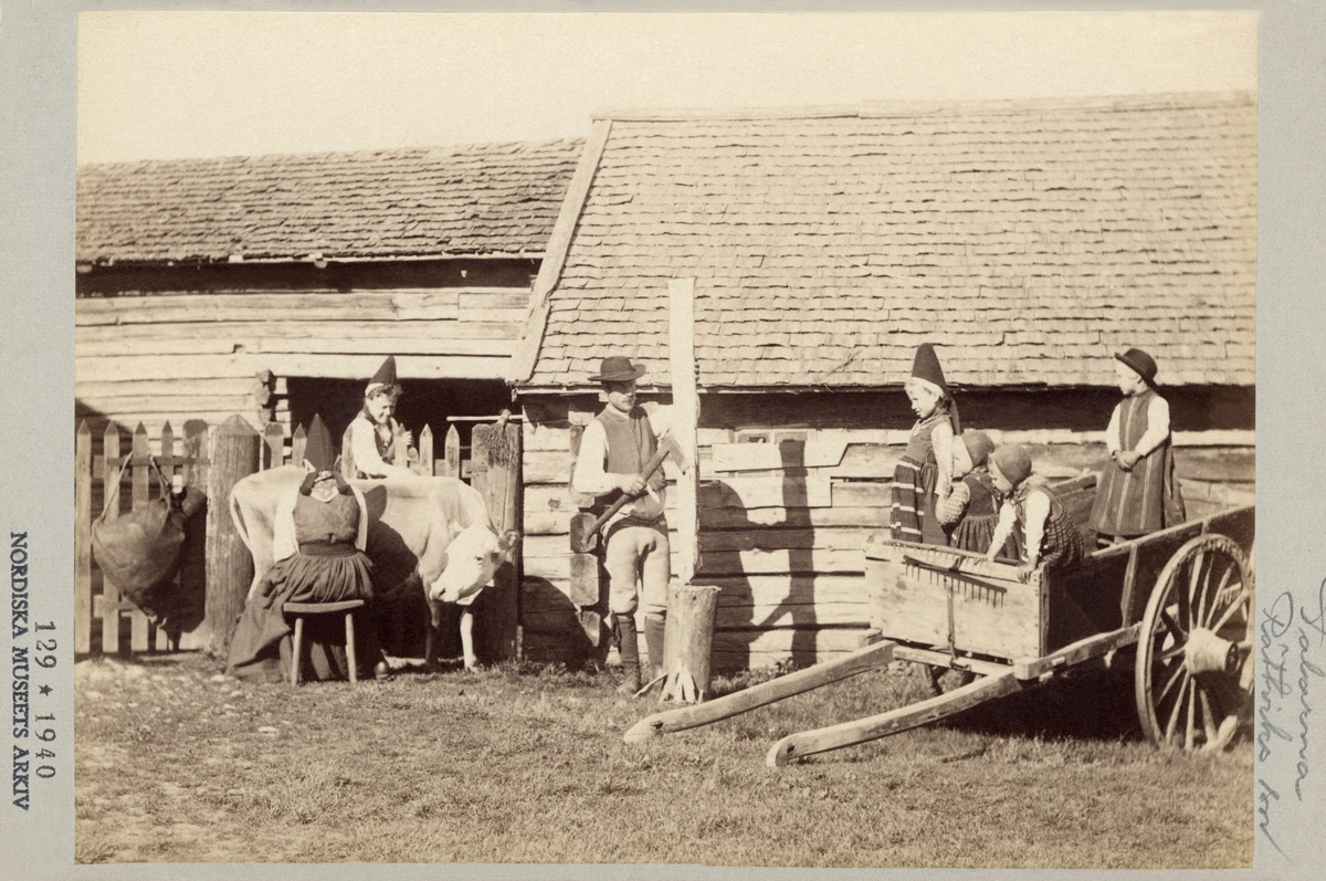 En kärra med barn i, kvinna mjölkar, en man hugger till en planka