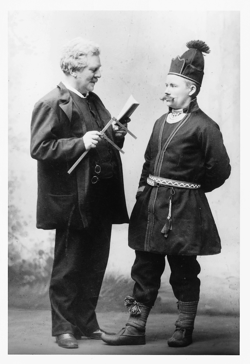 Antropologen Gustaf Retzius i färd med att mäta härjedalssamen Fjellstedts huvud, inom ramen för den rasbiologiska forskningen. Retzius till vänster i bild är klädd i kostym och håller ett skjutmått i ena handen medan han läser ur en bok. Framför honom står Fjellstedt iförd traditionell samisk dräkt.