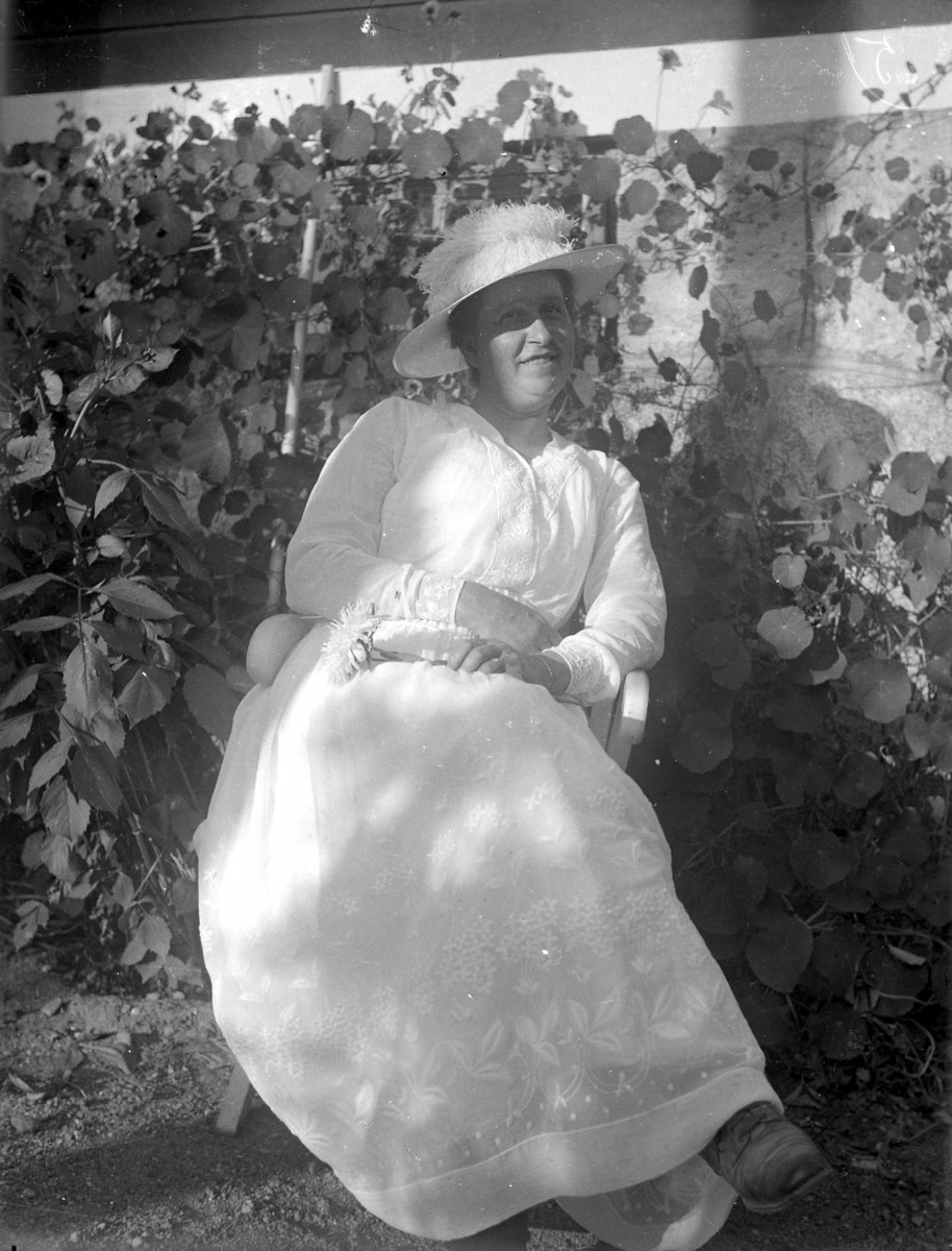 Porträtt av en kvinna i vit hatt och klänning. I bakgrunden en husgrund och slingerkrasse.