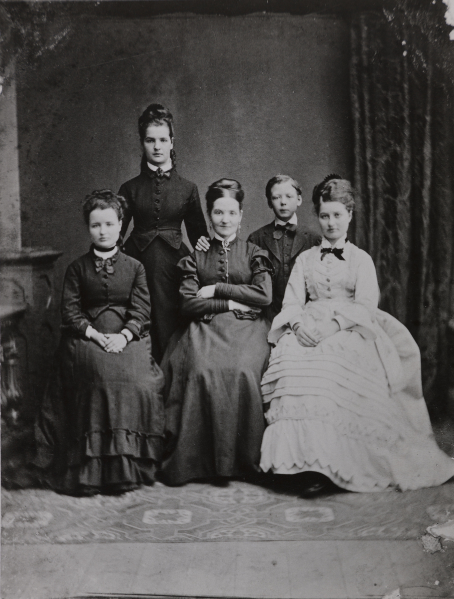 Grupporträtt av medlemmar i August Strindbergs familj. Styvmodern Emilia Charlotta sittande i mitten med sina styvdöttrar Anna (i vitt), Elisabeth och Eleonora (stående) samt den egna sonen Emil.