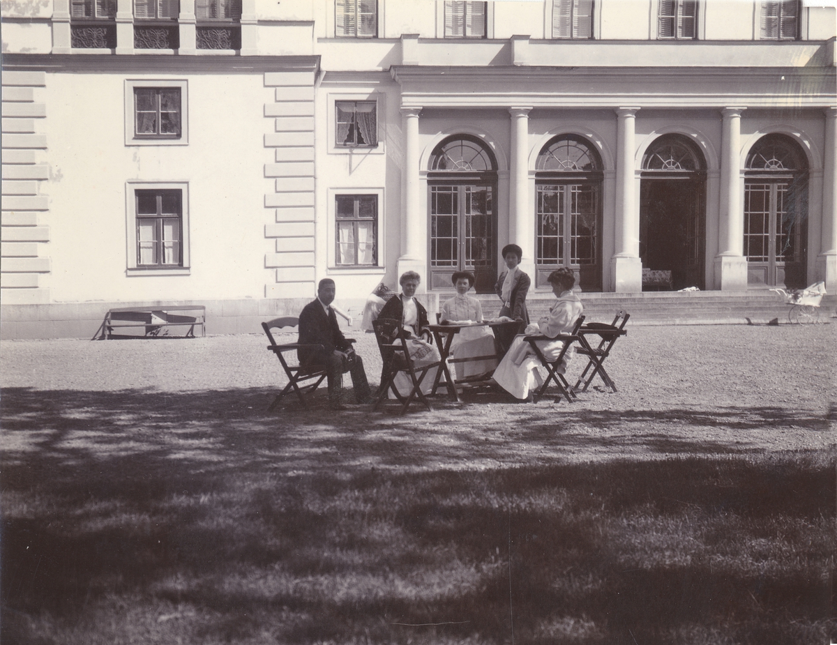 Ett sällskap sitter runt ett bord på gården framför en slottsbyggnad.