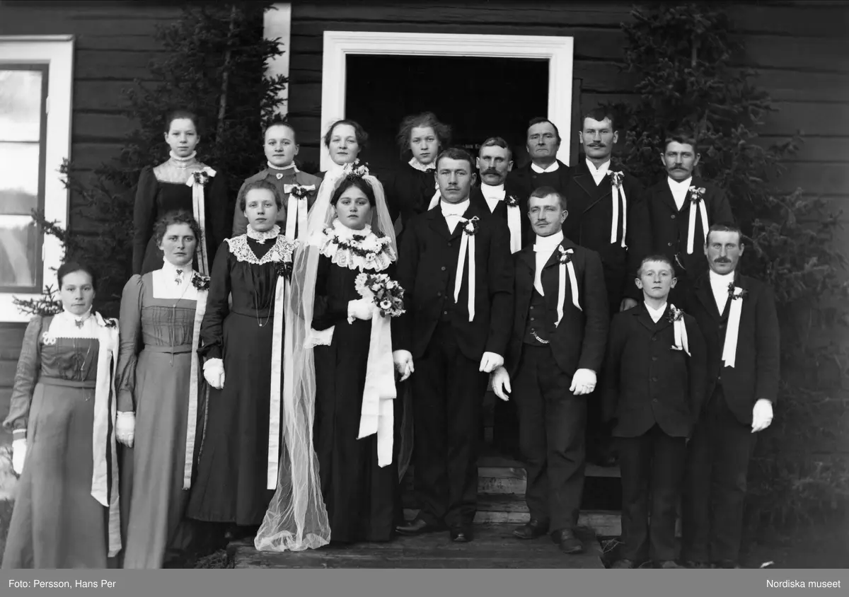 Gruppbild vid bröllop. Lima, Dalarna. Brudparet Lindberg m bröllopsfölje : främre raden Brita Johansson, Utgårds-Sara, en syster till brudgummen, Emma o Janne Lindberg. Bakre raden : Erika Halvarsson, Sofia Holmström Maria Halvarsson, Rabb-Johan (brudens far) Olle på högen Bergslags - Matsson.