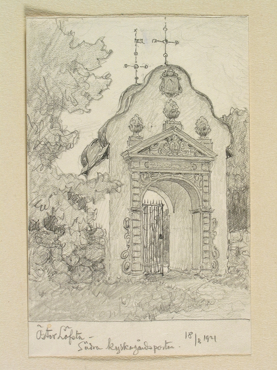 Teckning av Ferdinand Boberg. Uppland, Olands hd., Öster-Lövsta kyrka, Södra kyrkogårdsporten
