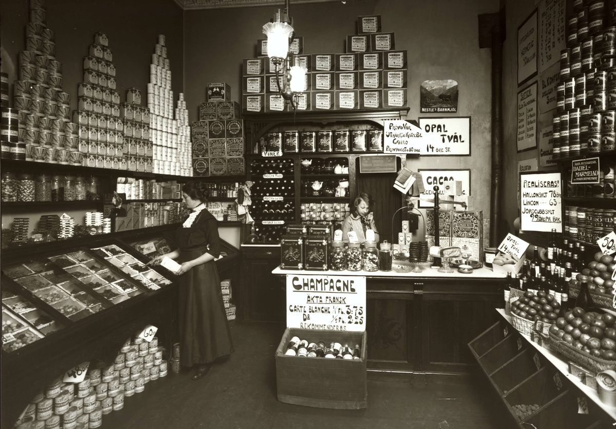 En av Stockholms mest kända delikatessaffärer. Sortimentet var främst potatis, frukt, viner, konserver, tvål, godis. Interiör. Ett kvinnligt biträde talar i telefon, ett annat biträde lägger varor i en påse.