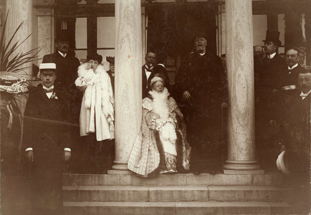 Demonstration för Konungahuset efter det att norska stortinget beslutat om unionens upplösning 1905. Konung Oscar II och Drottning Sofia vid Rosendals slott på Djurgården, Stockholm.