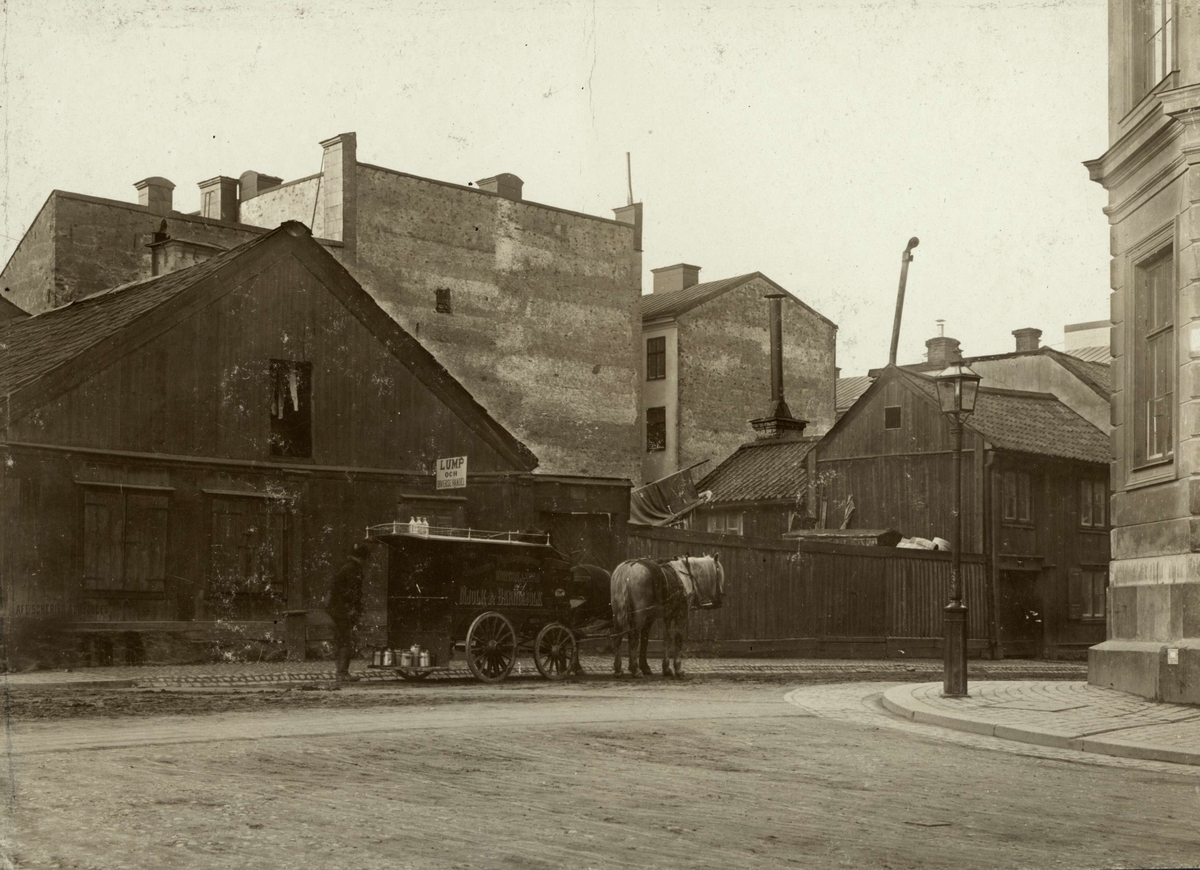 En hästdragen mjölkvagn i korsningen Linnégatan/Artillerigatan, Östermalm, Stockholm