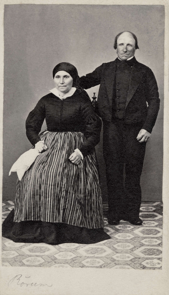 Parporträtt, kvinnan iklädd sjalett och randigt förkläde sitter, mannen står vid hennes sida. Skåne, Albo härad, Rörums socken. Nordiska museet inv.nr. 18533B.