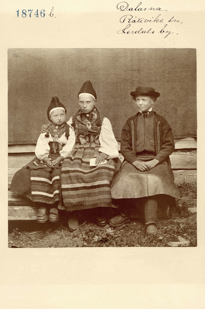 Tre barn sitter på en bänk, klädda i folkdräkter