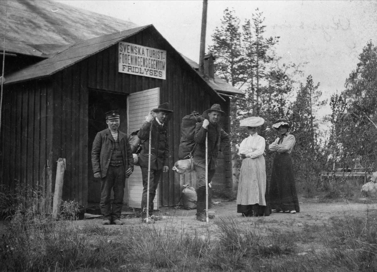 Tre män och två kvinnor utanför Svenska Tursitföreningens stuga