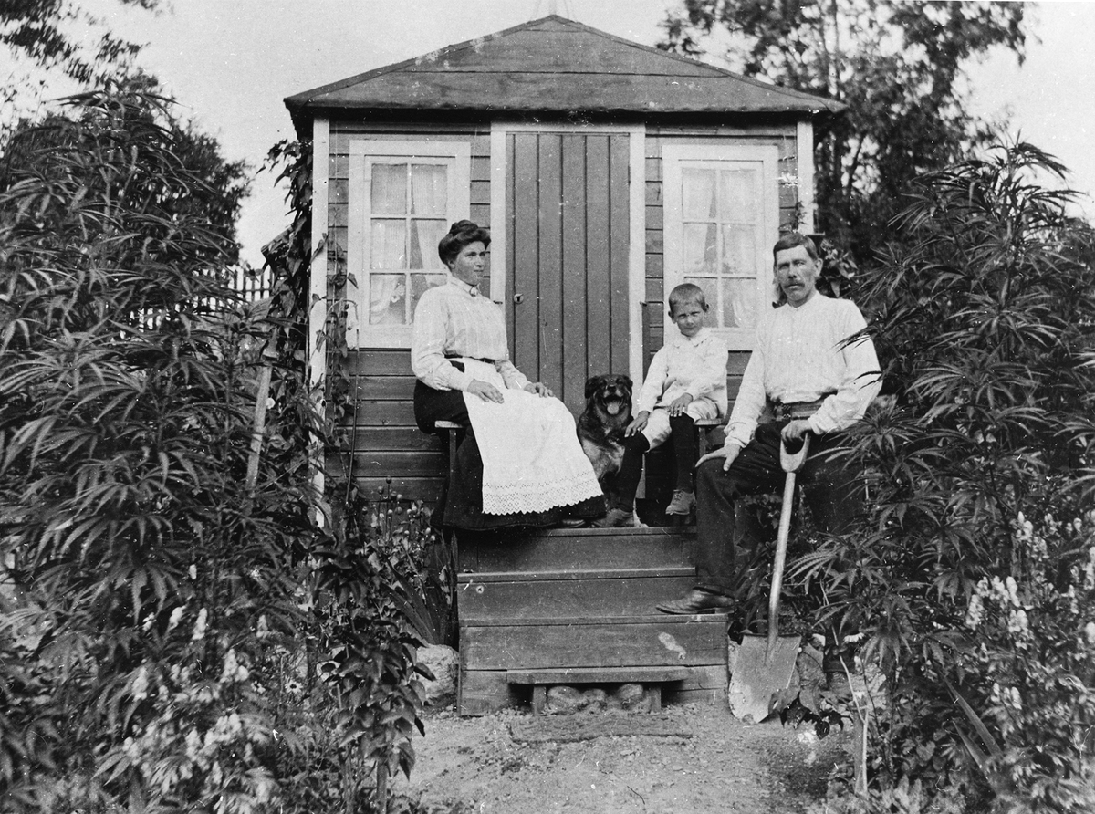 Man, kvinna, pojke och hund framför stuga. Koloniträdgård i Eriksdalslunden, Stockholm.