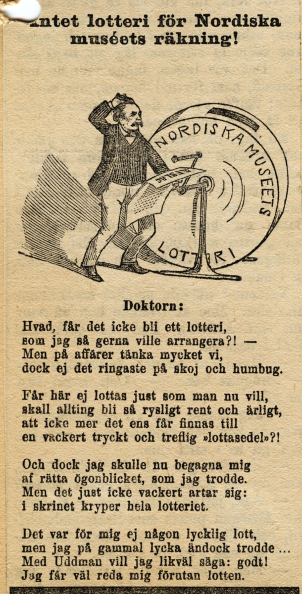 Skämtteckning / nidbild föreställande Artur Hazelius med ett lotterihjul. Rubriken lyder "Intet lotteri för Nordiska muséets räkning!"