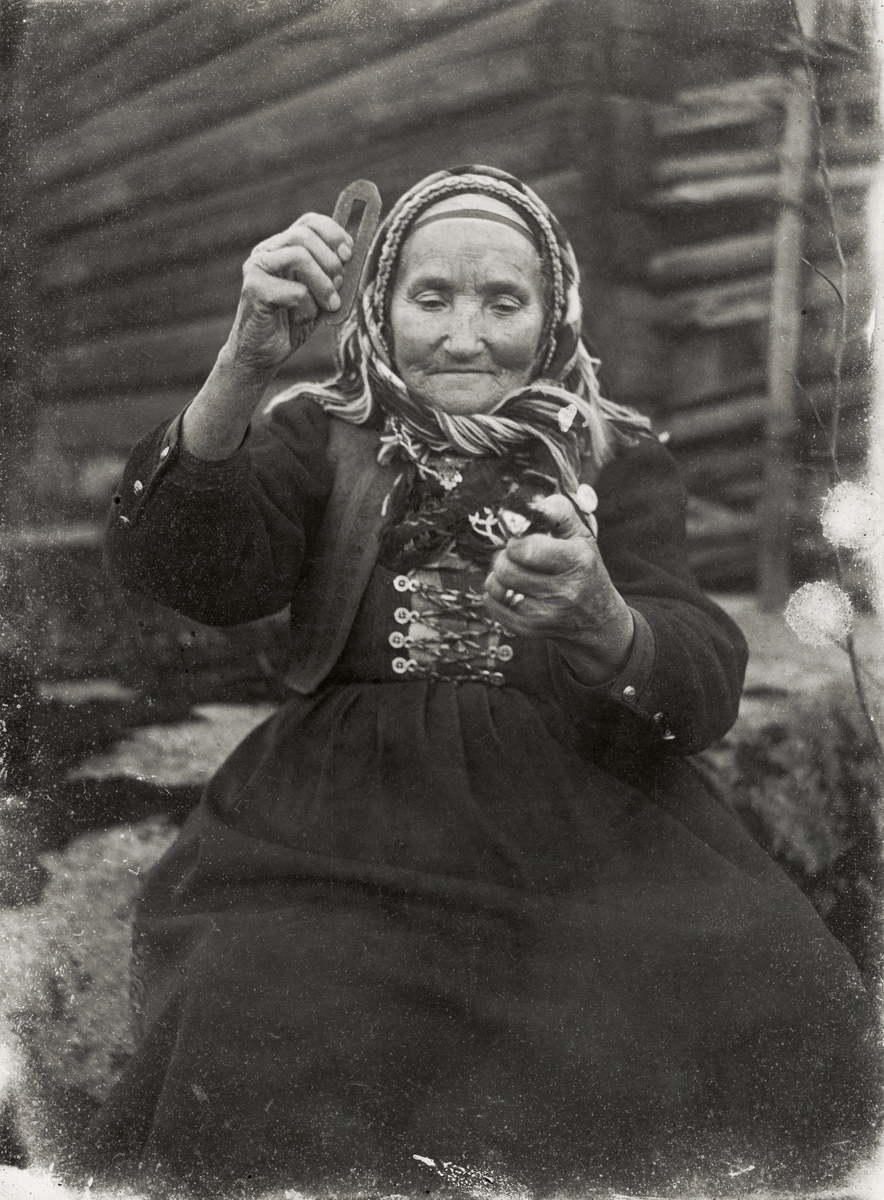 Eldslagning. Bullermor Stina Persdotter slår gnistor med ett ovalformigt stål mot en flintbit, som hon håller fasttryckt mellan motsatta handens tumme och pekfinger. Gangef sn, Dalarna.