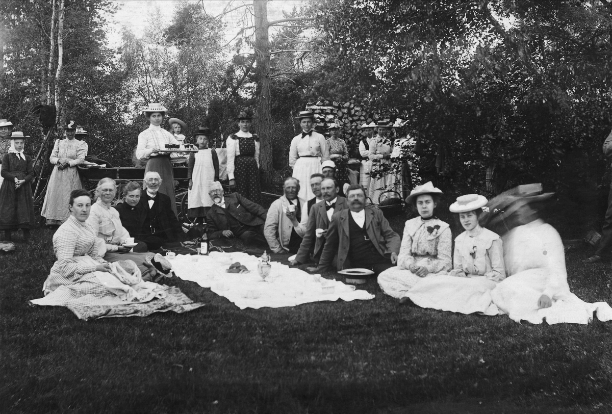 Jordbruk, slåtter- och skördegillen. Gotland. Autndag. "Hallbjäns-Petterssons grupp i Trananga med landshövdning Wall, fröken Wall mfl".