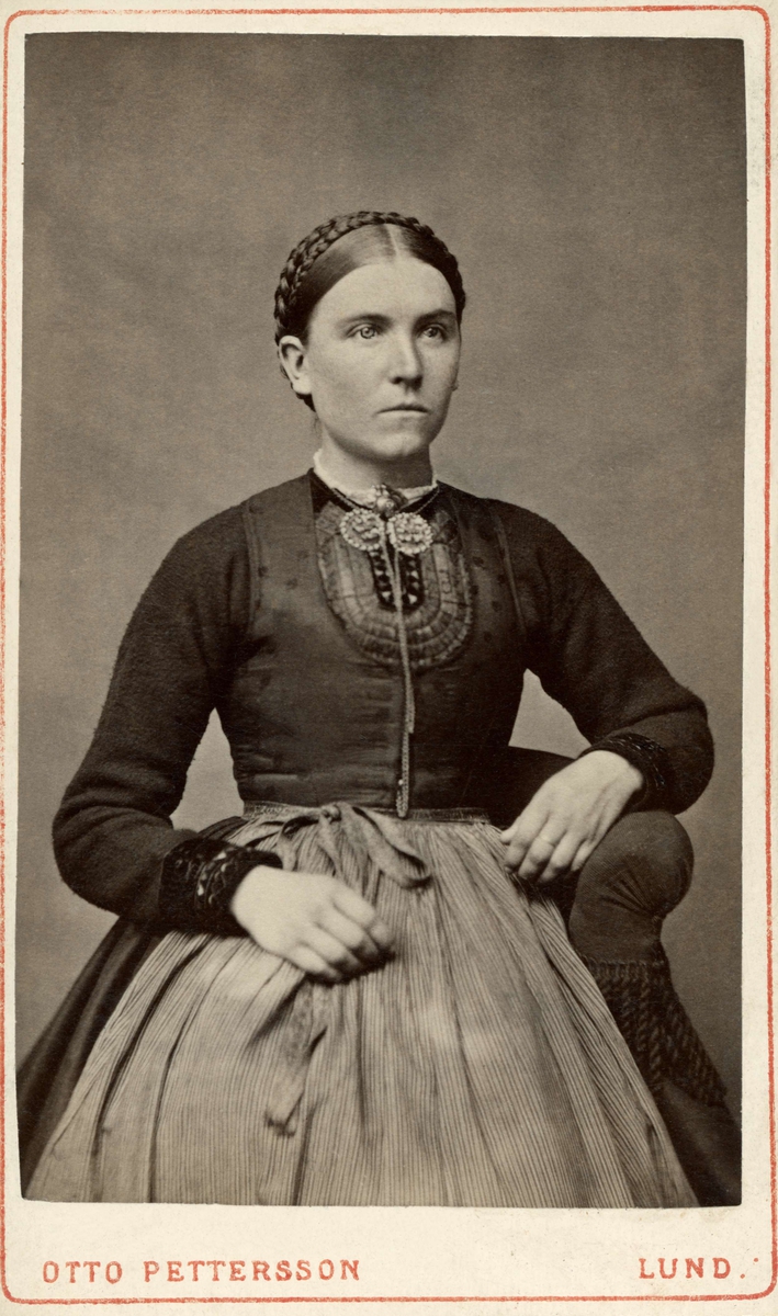 Kvinna från södra Skåne klädd i stickad tröja s.k. spedetröja med dekor kring halsringning och ärmkanter samt med livstycke.