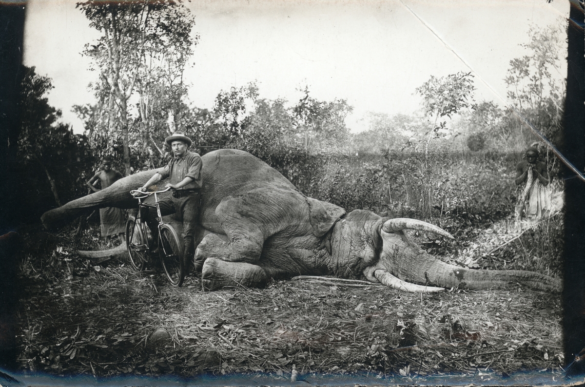 Storviltjakt, Afrika. En vit man i hatt med cykel lutar sig mot en fälld elefant som betraktas av en svart man till höger i bild.