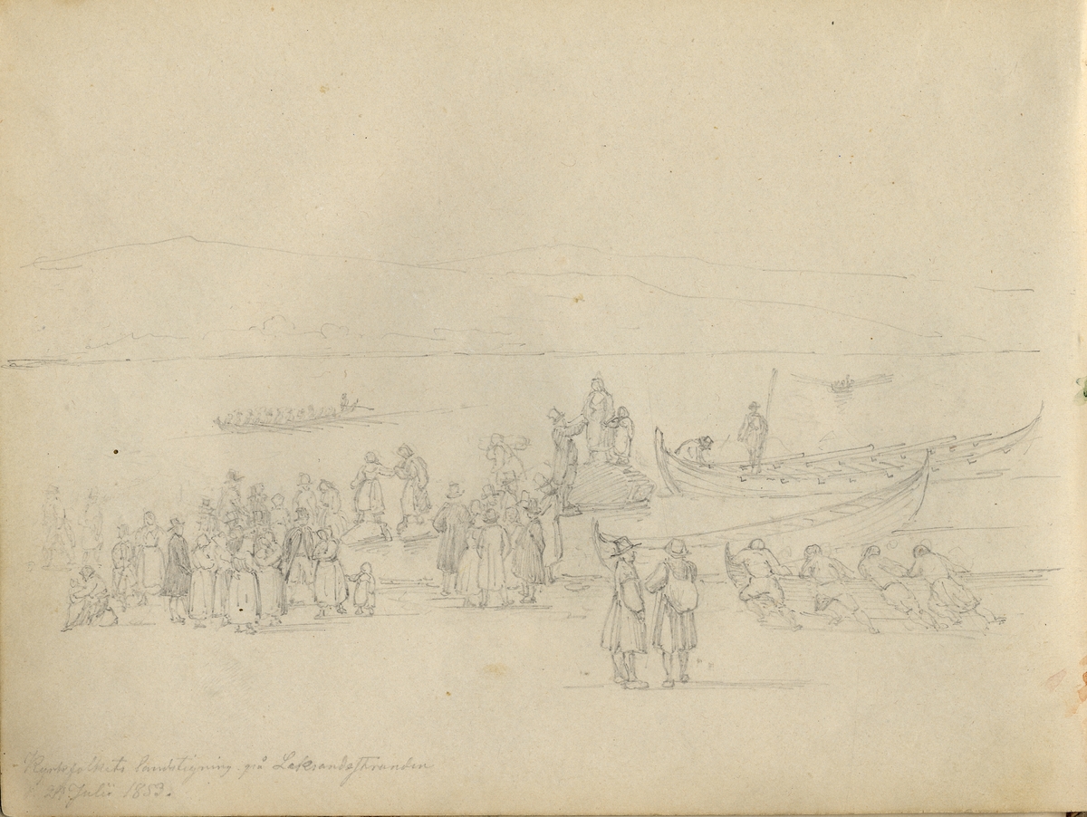 Blyertsskiss. Folksamling på strand, kyrkbåtar. " Kyrkofolkets landstigning på Leksandsstranden(ortnamnet osäkert ?) den 27 (?) juli 1853." ur skissbok märkt G.V Palm, Nordiska museets arkiv.