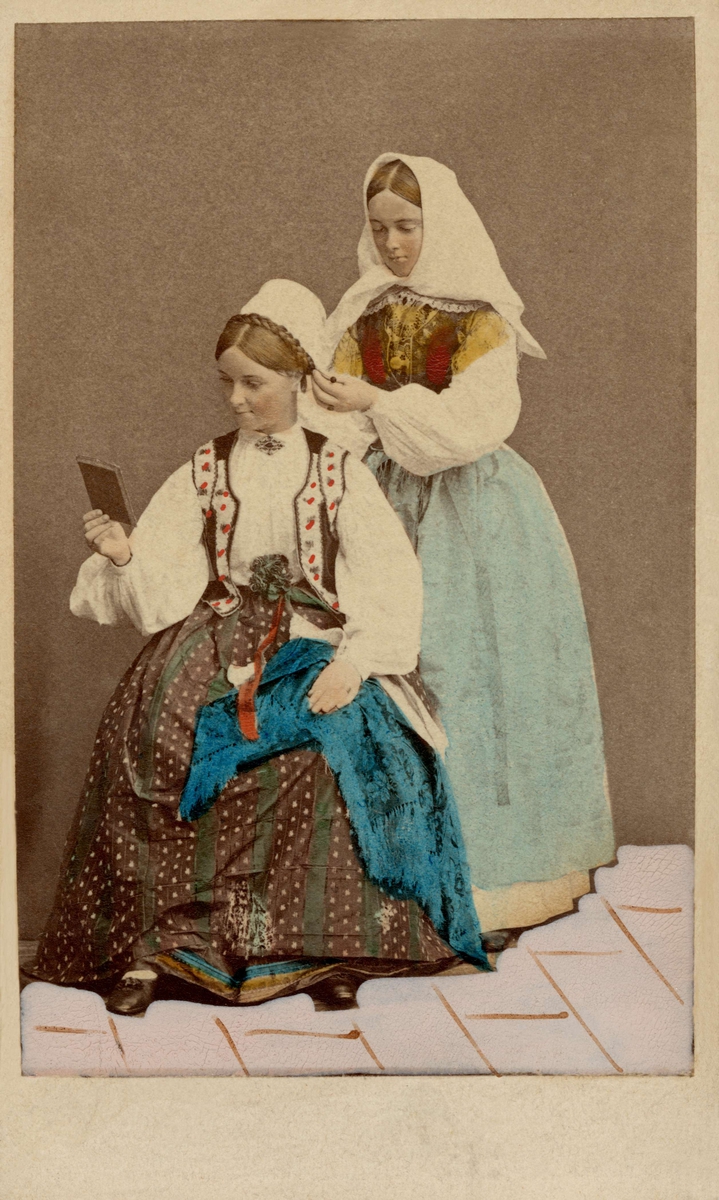 Dräktdockor med huvuden skulpterade av C A Söderman, visade på världsutställningen i Paris 1867. Två kvinnor i folkdräkter från Blekinge, varav en hjälper den andra med huvudbonaden. Handkolorerad version.