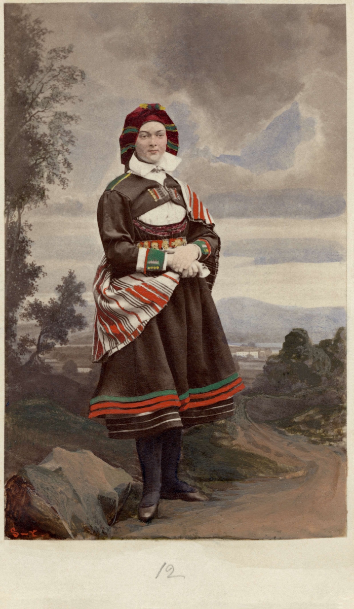 Kvinna i folkdräkt. Handkolorerat fotografi. Dräkt från Hallingdal, Norge.
