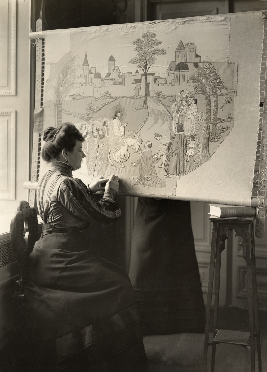En kvinna, sannolikt Mimmi Börjeson, sitter framför ett fönster och arbetar med ett broderi, påläggsöm.