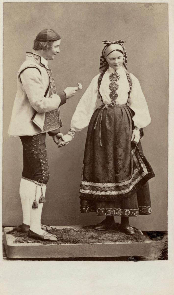 Dräktdockor med huvuden skulpterade av C A Söderman, visade på världsutställningen i Paris 1867. Man och kvinna i dräkter från Hetterdal, Telemarken, Norge.