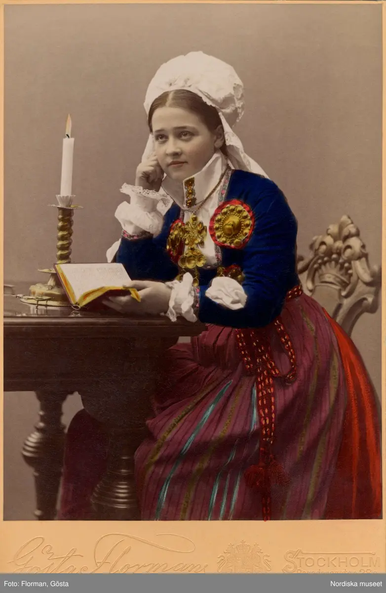 En ung flicka i dräkt från Herrestad eller Järrestad, Skåne, sitter vid ett bord med en bok.