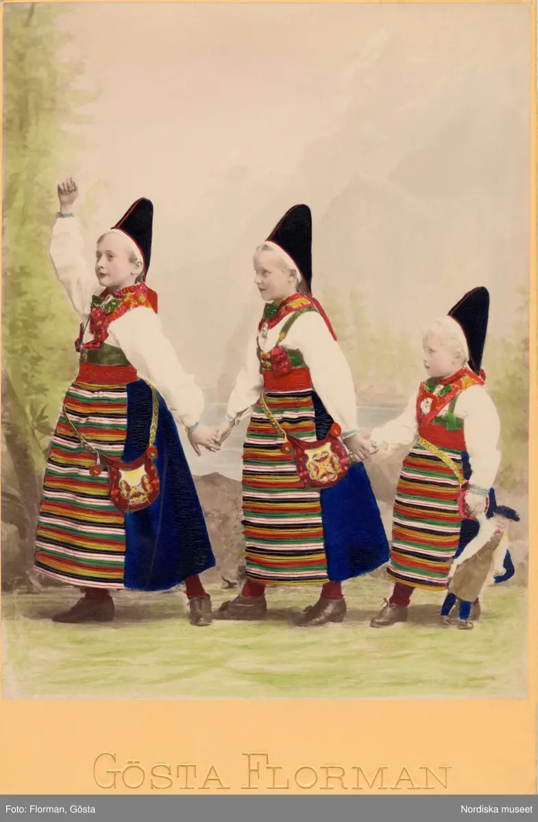Tre flickor på rad, klädda i likadana folkdräkter. Olika åldrar