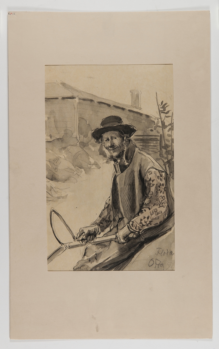 Laverad teckning av Otilila Adelborg. Mansdräkt från Floda. "Flodagubbe".