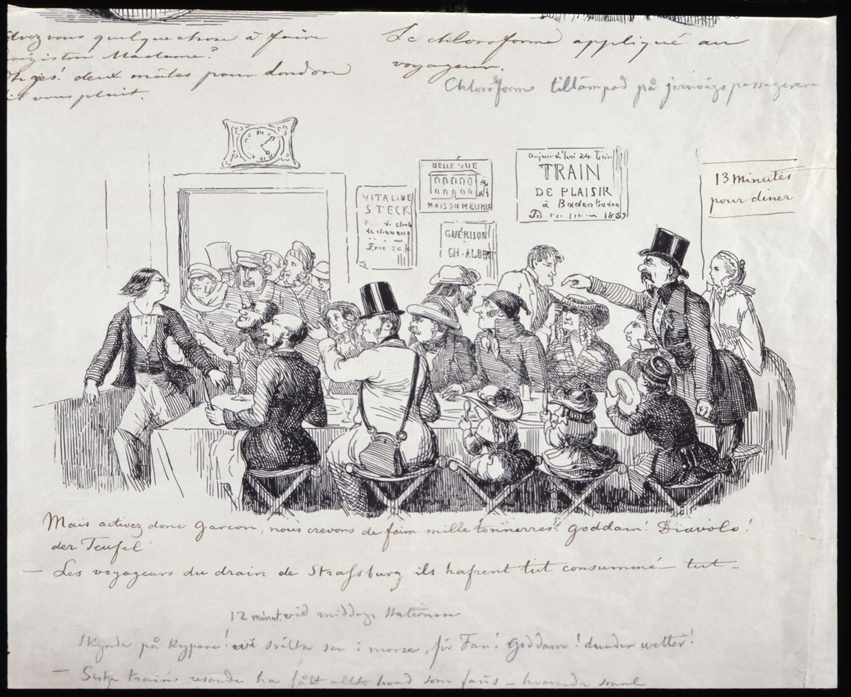 Otåliga restauranggäster. "Skynda på kyparen, vi svälta sen i morse". Tusch av Fritz von Dardel