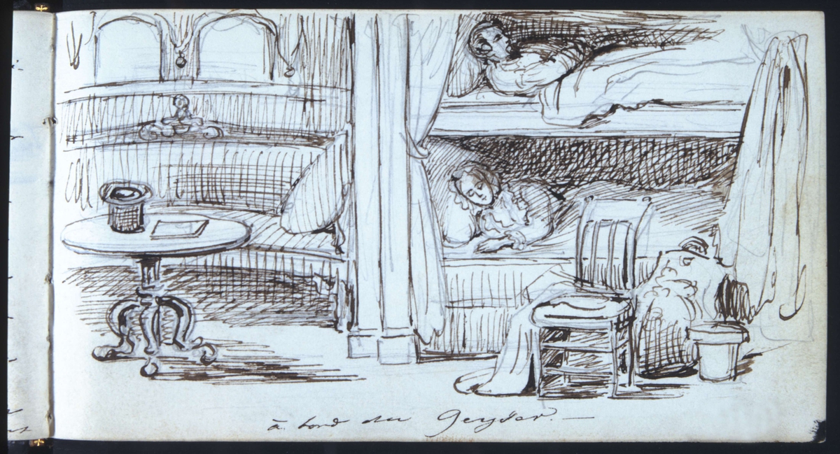 "Bröllopsresan, ombord på Geyser". Tuschteckning av Fritz von Dardel