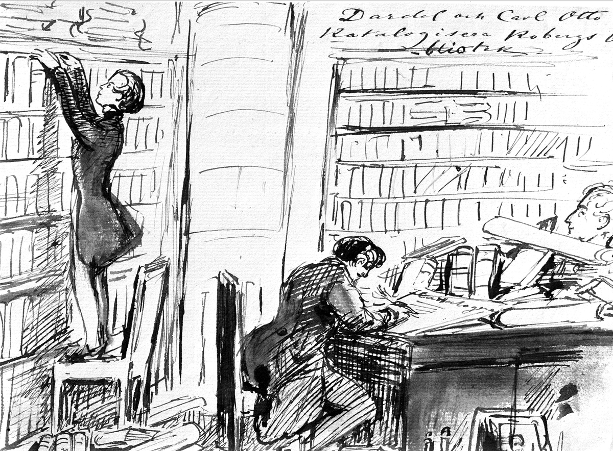 Biblioteksinteriör. En ung man plockar böcker i hyllorna, en annan antecknar. "Dardel och Carl Otto katalogisera Kobergs bibliotek.". Tusch av Fritz von Dardel.