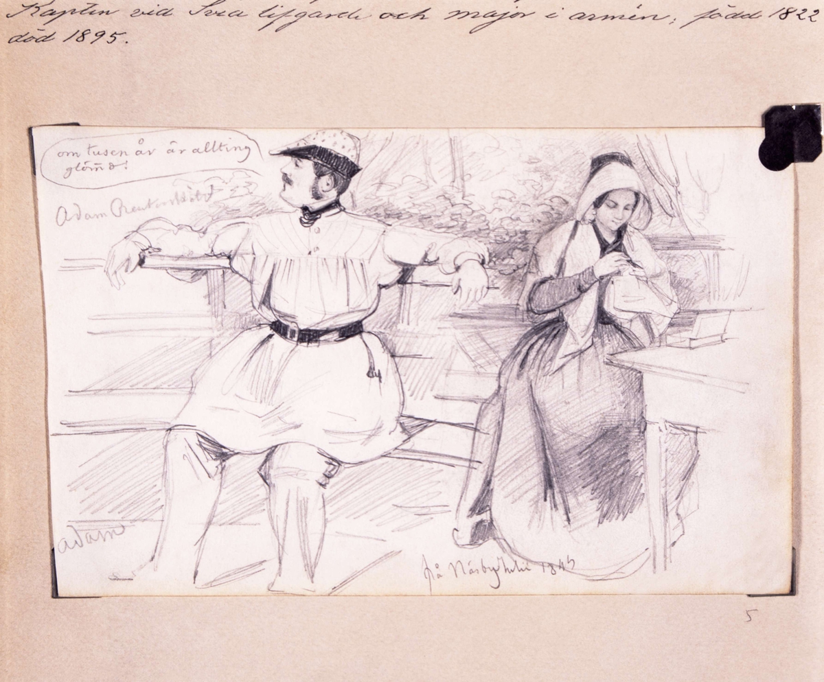 Titel: "Kapten vid Svea lifgarde och major i armén, född 1822 död 1895". Adam Reuterskiöld och en kvinna. På Näsbyholm 1845. Blyertsteckning av Fritz von Dardel, 1845