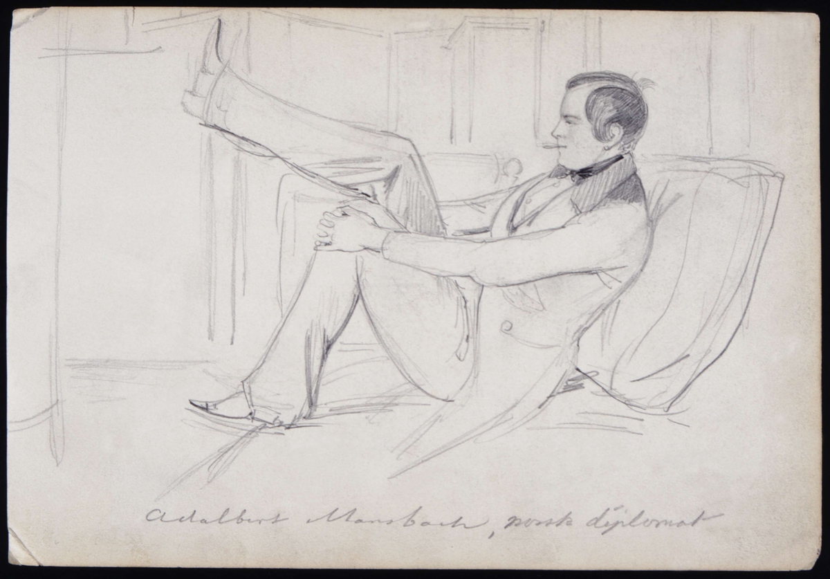 "Adalbert Monsbach, norsk diplomat". Blyertsteckning av Fritz von Dardel.