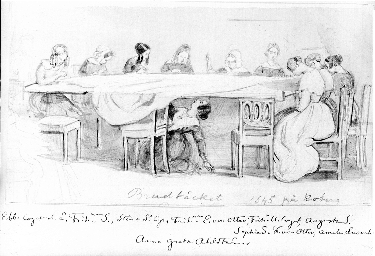 Teckning av Fritz von Dardel. "Brudtäcket 1845 på Koberg." Tio namngivna kvinnor sitter runt och under ett bord och syr på ett täcke.
