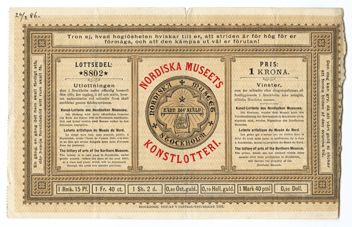 Lottsedel. Nordiska museets konstlotteri 1885. Fram- och baksida.